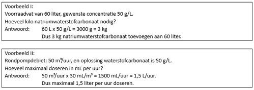 Aan de hand van de grootte van het voorraadvat en de gewenste concentratie bereken je eenvoudig hoeveel natriumwaterstofcarbonaat je kunt doseren. Met het rondpompdebiet en de oplossing waterstofcarbonaat reken je uit hoeveel liter je per uur doseert.