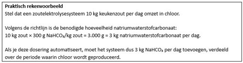 “Automatiseren loont,” benadrukt Blom. “Dan loopt de dosering synchroon met de chloorproductie en hoef je niet zelf steeds bij te stellen. Een handige controle is om het verbruik van zout en natriumwaterstofcarbonaat naast elkaar te leggen. Als je 10 kilo zout omzet, hoort daar ongeveer 3 kilo natriumwaterstofcarbonaat bij. Zit je daar ruim boven? Dan heb je de kans dat er te veel waterstofcarbonaat gedoseerd wordt, wat weer tot een ongewenst zuurverbruik leidt.”